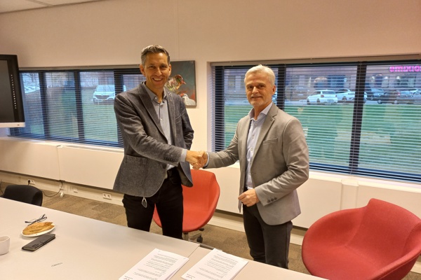 Directeur-bestuurder Antoine Pekel (links) en John de Beijer van Giesbers Bouwen en Ontwikkelen tekenen voor 49 nieuwe sociale huurwoningen.